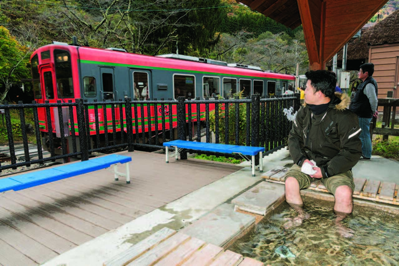 塔のへつりからほど近い場所にある「湯野上温泉駅」の駅舎は茅葺き屋根のあるレトロな建築だ。中には囲炉裏もあったりして趣深い。なにより、僕が訪れたかったのは駅舎に併設された足湯。ここらで一旦あったまっとこうという魂胆だ。ちょっぴり冷えた足元に足湯の温かさが染みる。しかも足湯からは会津鉄道が行きかう様子を眺められるので、鉄道ファンのみならず旅好きの人が旅情を感じられる場所でもあるのだ。