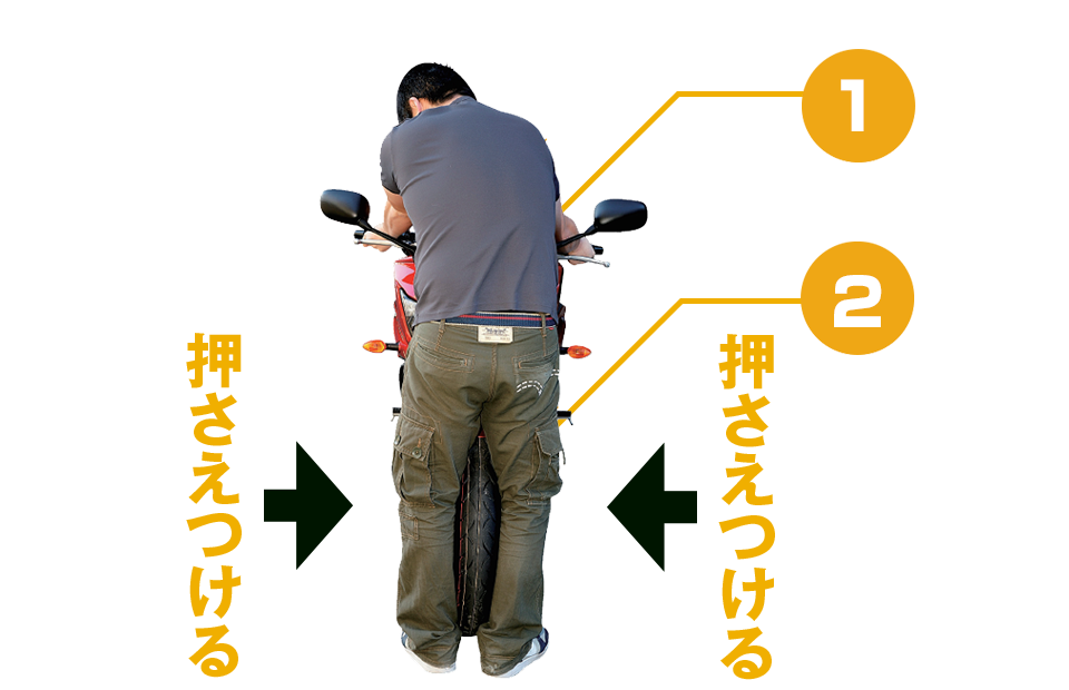 車体前方から両ハンドルを握り、下半身でホールドしたら腰を使ってハンドルを左方向にこじる