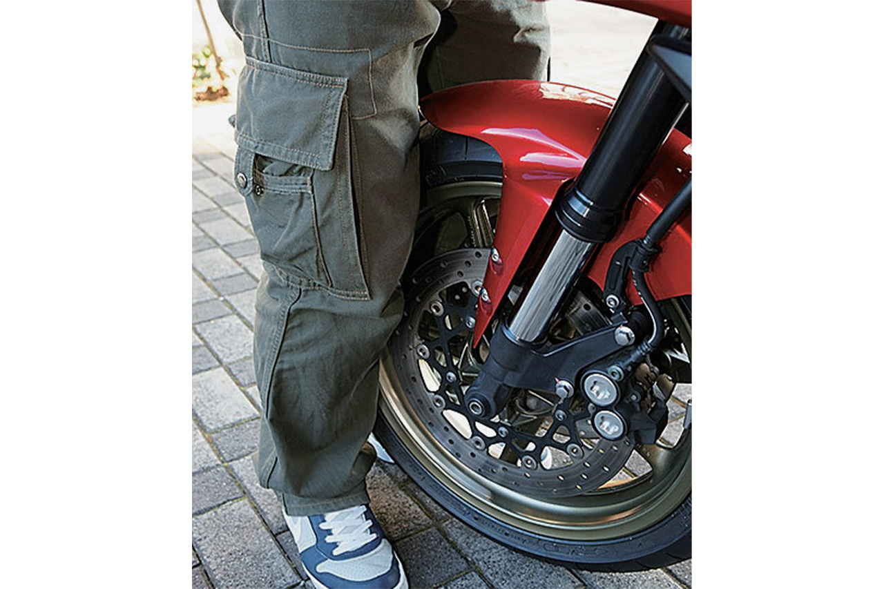 写真では分かりづらいが、転倒の衝撃でフロントフォークが左方向に歪んでしまった実例。このまま走行すると直進中もハンドルが右方向に切れた状態となり、ライダーは強い違和感を覚えるはずだ
