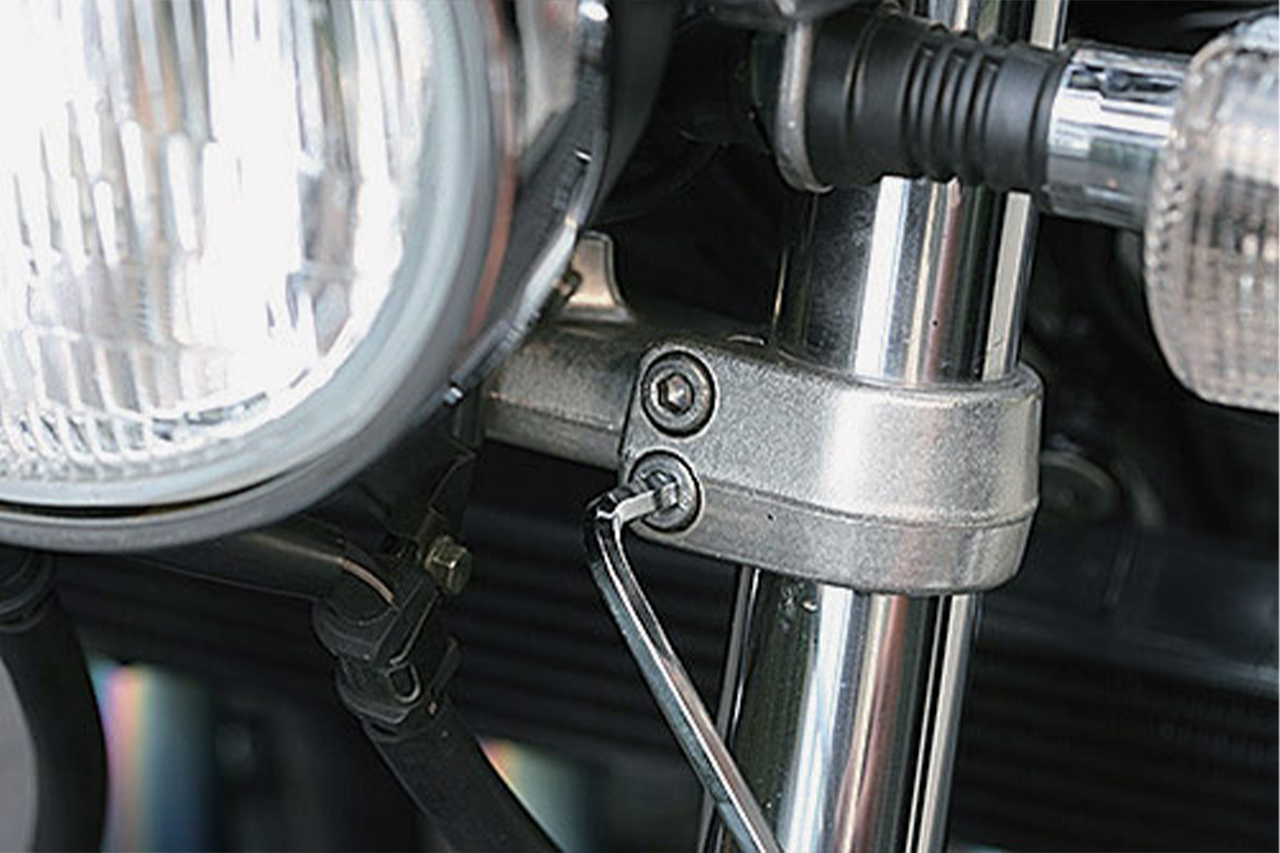 フロントフォークを固定しているアンダーブラケットのボルトをすべて緩めてみよう。たいていの歪み(ねじれ)はこの作業により解消する確率が高い