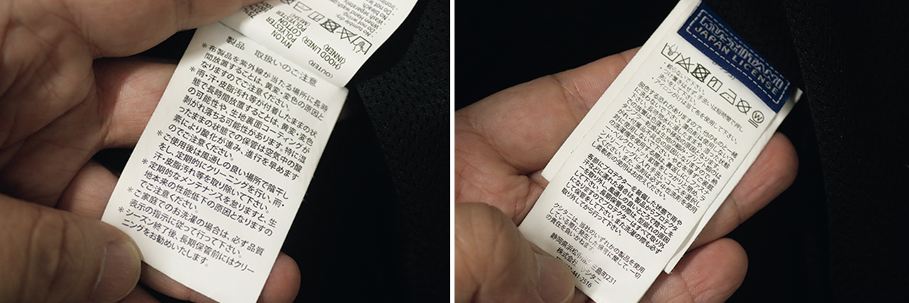 洗濯タグはジャケットなら内側左側面に縫い付けられている。洗濯機や乾燥機の使用が可能か否かなどがアイコンで表示されている。クシタニの場合は日本語で丁寧な説明が印字されているので、しっかりと読んでから洗濯しよう