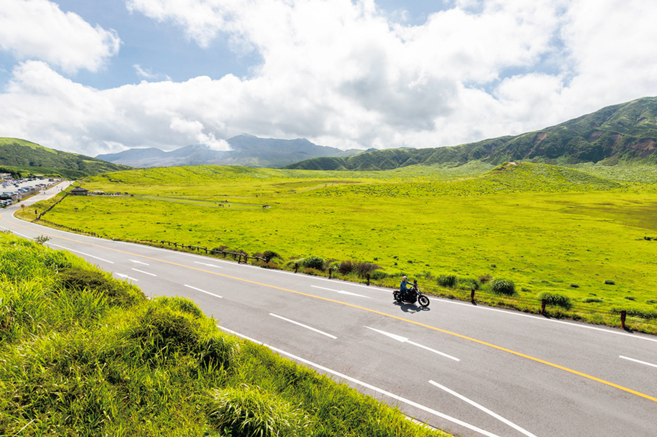熊本県阿蘇五岳を貫く絶景ツーリングロードは広大な草原を縫うように伸びる道。緩やかなカーブと雄大なスケール感で、秋になると草原は黄金色に染まり、木々の紅葉も美しい