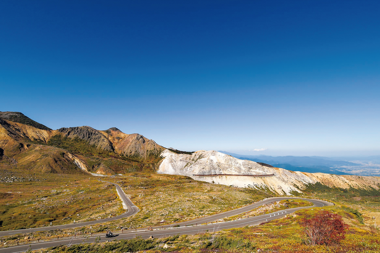 福島県の高湯温泉から土湯峠を結ぶ全長約29㎞の道で日本の「道百選」にも選ばれた名ルート。モミジやナナカマドが美しく染まる秋は見どころ十分。浄土平付近は、火山地形ならではの迫力ある風景。冬季閉鎖は例年11月中旬ごろから