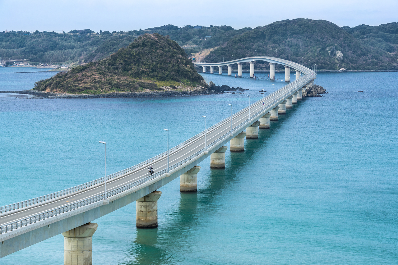橋の全長は1780m。大型船舶の航行に対応するため島側は高さがあるが、ほとんどの区間で橋脚がぎりぎりまで低く設計されているため、橋上から海面が近い。足元に広がる海は、水深や海流などの違いによってやや色味を変えながら、エメラルドグリーンやコバルトブルーに美しく光り輝く