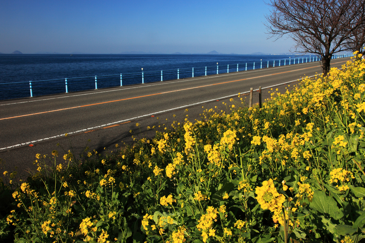 夕やけこやけラインは伊予灘に面した国道378号のうち、伊予市双海町と大洲市長浜町を結ぶ区間に付けられた愛称。急カーブは皆無で、双海町側から夕日を見ながら走るもヨシ、伊予長浜側から、海をさらに近く感じながら走るのも爽快だ