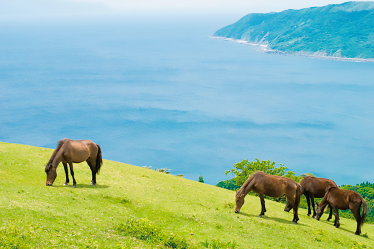 日南フェニックスロードの終点にある都井岬では江戸時代の放牧から野生化した御崎馬(みさきうま)が生息しており、愛車で走りながら眺めることができる