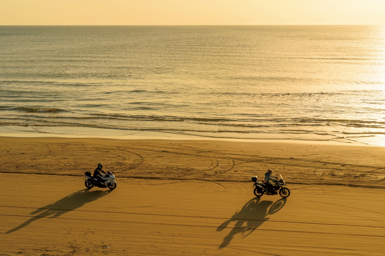 石川県の宝達志水町から羽咋市千里浜町までの海岸線に設けられた全長約8㎞の、国内で唯一砂浜観光道路として開放された道。能登半島の西側付け根あたりに位置するため、日本海の向こうに沈む夕日を眺めながら、間近に波が打ち寄せる海の砂浜をバイクで走るという貴重な体験ができる
