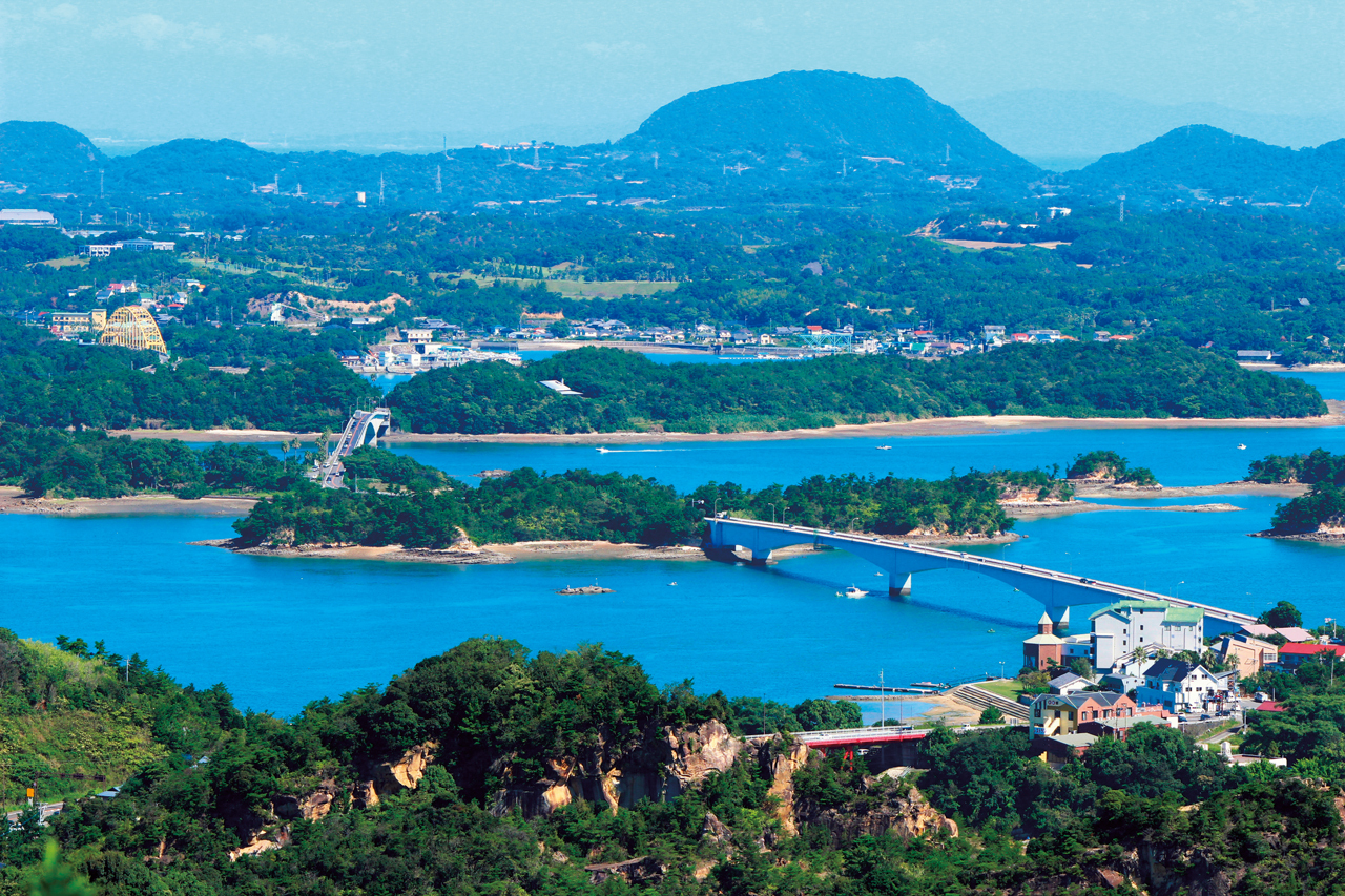 天草パールラインは、国道266号の一部区間で、天草五橋とも呼ばれる橋梁で海を渡り、島内を一般道として巡る。橋上では、近くに大小さまざまな島が浮かんだ美しい海を眺めながら走ることができる