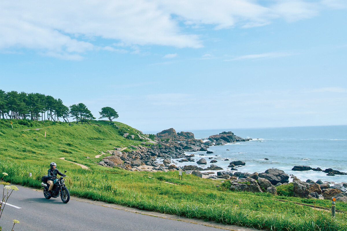 八戸市内でホンダCL250をレンタルし、リアキャリアにツーリングバッグをくくり付けて出発。まずは太平洋沿岸の景勝地である「種たね差さし海岸」を目指した。最初に立ち寄ったのは、パワースポットとしても人気の蕪かぶ嶋しま神社。ウミネコの繁殖地として知られる。お参りすると「運」をいただけると言われているが、ウミネコの「ウン」はいただかないように、無料貸出の傘で防いで参拝しよう。8月以降はほぼすべてのウミネコが蕪島から離れるとのこと。