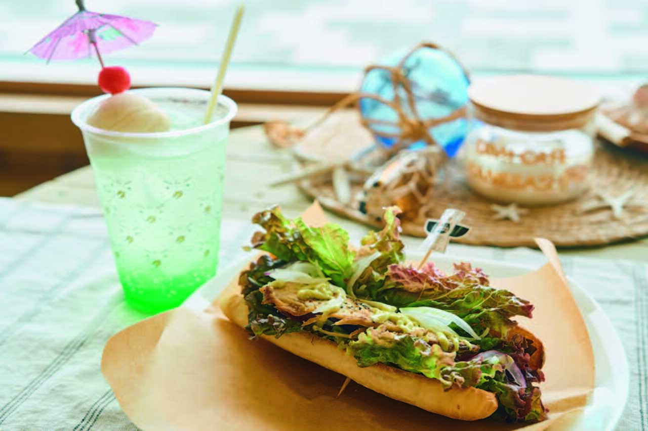 さらに海岸沿いを走っていくと、古代遺跡のような建造物を発見。「葦あし毛げ 崎ざき展望台」は太平洋戦争末期に旧日本軍が建造した砲台の跡地で、現在は潮風に吹かれながら爽やかな海岸の風景を一望できる展望台。ランチは一面に広がる天然芝生地を目の前に食事ができる「海カフェ たねさし」へ。地元食材を使ったメニューが多数あり、シートをレンタルして芝生でテイクアウトを食べることもできる。