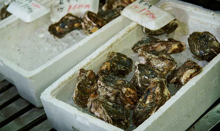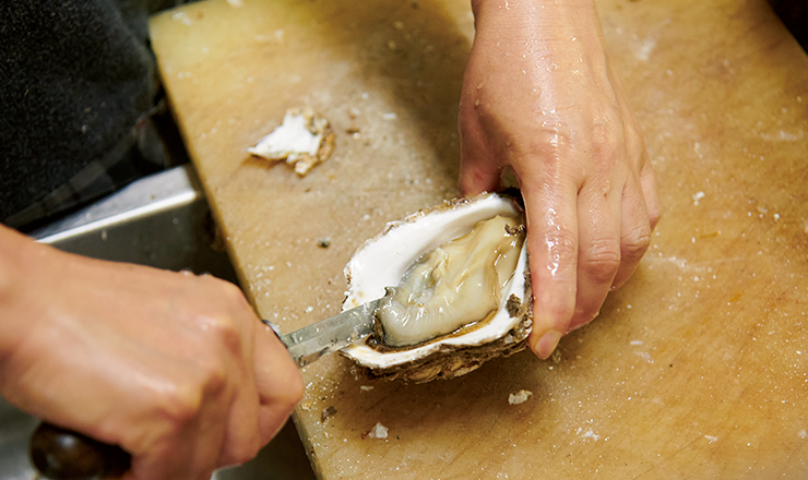 店頭で氷の上に並んだ岩牡蠣の中から、良さそうなものを選んでもらった。使い込んだナイフを使い、慣れた手つきで大きな岩牡蠣をその場で開けてもらう。レモン汁かポン酢でいただくのだが、一口で食べられるのか不安になる大きさだ。開けたばかりの貝殻から直接、思い切ってツルリと口の中へ。