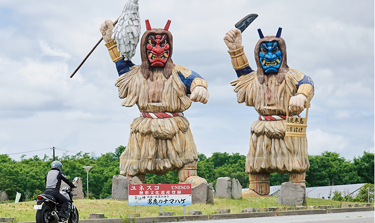 海沿いの秋田天王線を走る。ここは風力発電の風車が立ち並ぶ。いわゆる映えスポットの一つだ。20分ほど走ると、巨大な2体のナマハゲが現れる。ここ男鹿総合観光案内所で情報収集をしてから男鹿半島に入って行こう。