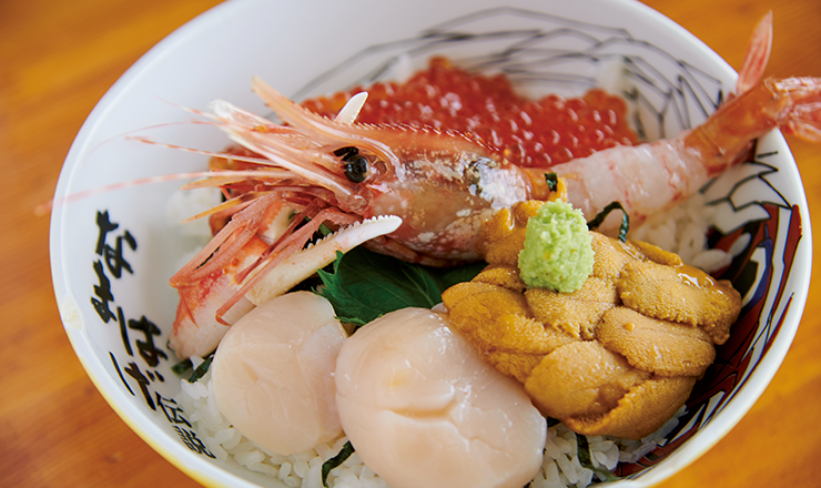 店先にはナマハゲ像があり、お決まりのセリフを叫んでいる。坊主頭の名物店主のお店。海鮮丼をはじめ様々な海の幸を生かしたメニューが並ぶ。貝好きならアワビが乗った「天空の神髄海鮮ナマハゲ丼」(3700円)も魅力的だ。上記写真は、時空を超えた海鮮丼(2300円)。