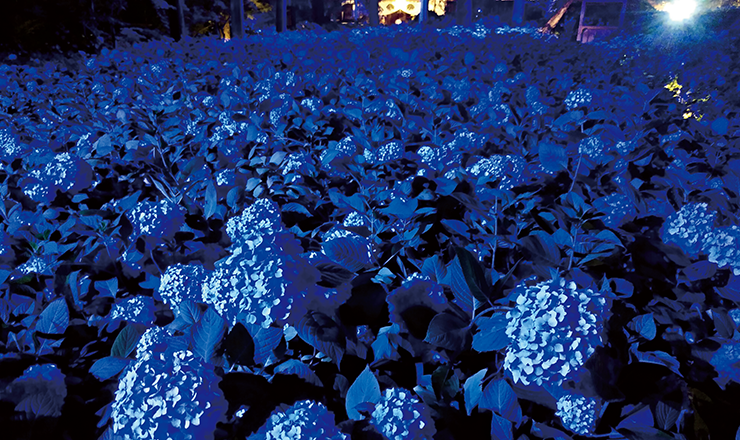 雲昌寺の古仲副住職が15年以上の歳月をかけて育てたアジサイが、男鹿の新たな見どころとして注目を集める。見ごろは6月中旬から7月上旬。平日の昼間でも多くの観光客が訪れる人気のスポットで、本年は期間限定でライトアップしたアジサイを鑑賞できる特別観覧(1000円)が実施された