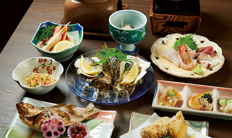 海鮮にうるさい地元の人たちも、美味しいものが食べたくなると泊まりでたつみ寛洋ホテルに来る。この日の夕食は新鮮なおつくりはもちろん、旬の大きな岩牡蠣が2つ、メバルの焼き物、カニなどがテーブルを埋め尽くす。シメは目の前で炊き上げる牡蠣の釜めし
