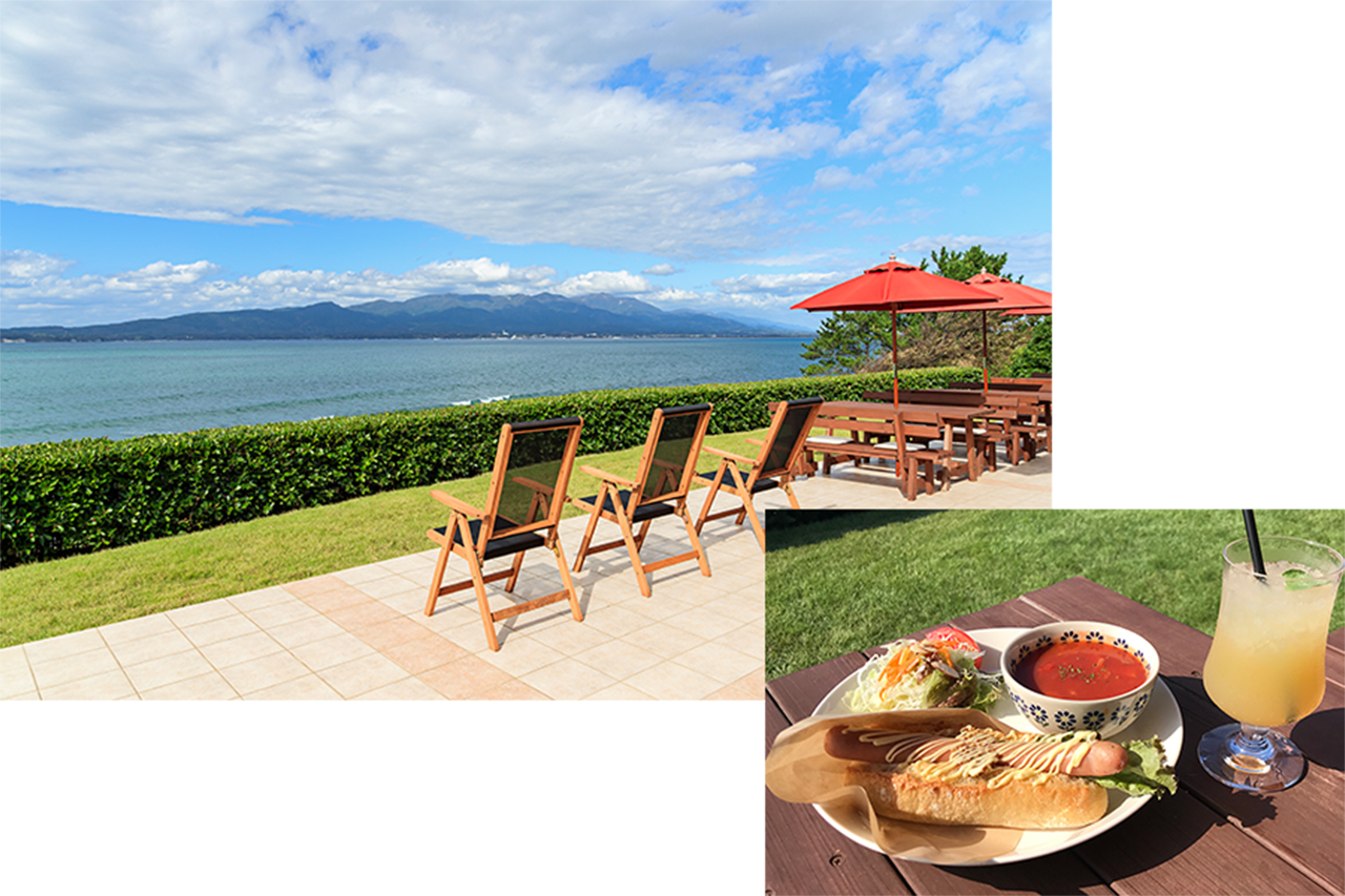 真野湾を望む絶景テラスが人気のカフェで、リゾート気分が満喫できる。自家製天然酵母のパンを使ったホットサンドやベーグルサンドなど、こだわりのメニューが並ぶ。西三川産のフルーツを使った添加物ナシの100%ジュースもオススメ。