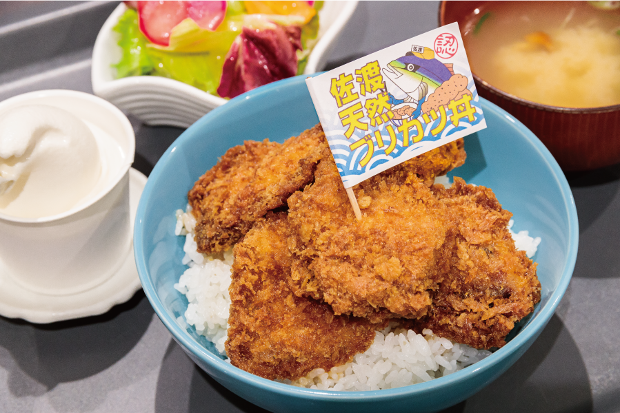 佐渡産の天然ブリ、佐渡市認証米を使った佐渡の名物丼が「佐渡天然ブリカツ丼」。特製あごだし醤油ダレで味わうのも特徴だ。写真は「たびのホテル」1階にある味彩のものでソフトクリーム付き。