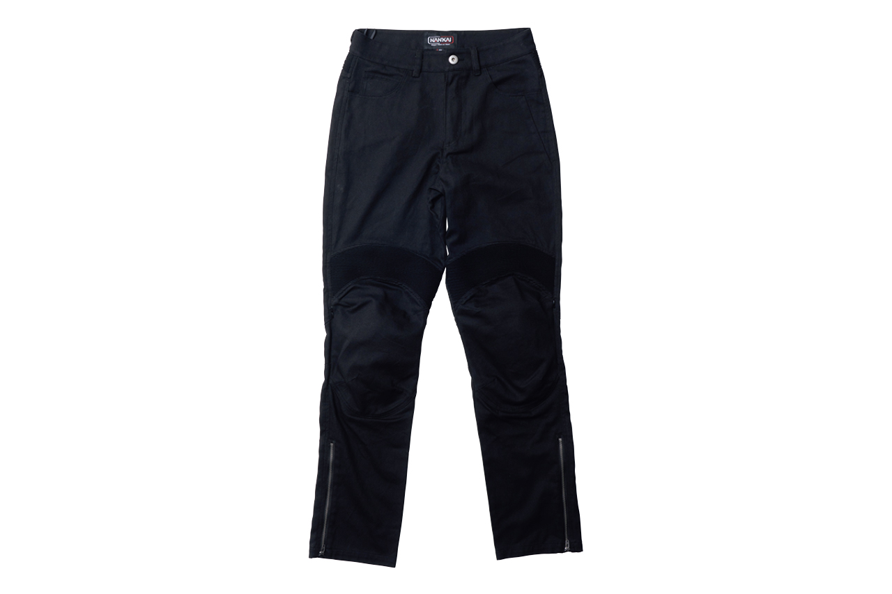 「ライディングキャンバスパンツ」のしっかりとした厚みのあるキャンバス生地は履き込むほどに馴染む。裾のファスナーでシルエット調整が可能で、膝と腰にはシャーリングを配置。さらにCEプロテクターを標準装備したスリムテーパードシルエットで、見た目と機能を両立。