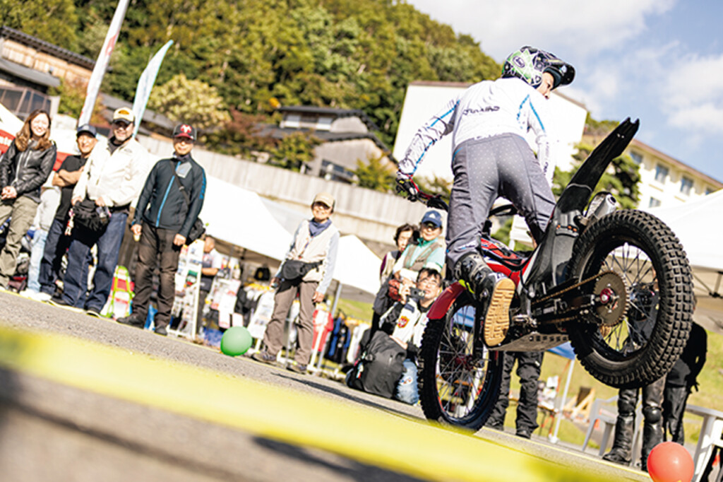 雫石町を眼下に一望できる会場には、2日間で750人のライダーが集結。両日ともに抜けるような青空が広がり、雫石町長も来場。MCの福山理子さんの軽快なトークで会場は笑顔に包まれた。MFJ国際A級ライダー・高橋健啓さんと沢上祐介さんによるトライアルショーでは、会場がどよめくほどの超絶パフォーマンスを披露。岩手の伝統行事「チャグチャグ馬コ」も登場し、華やかな装束の馬とライダーたちの記念撮影も行われた。