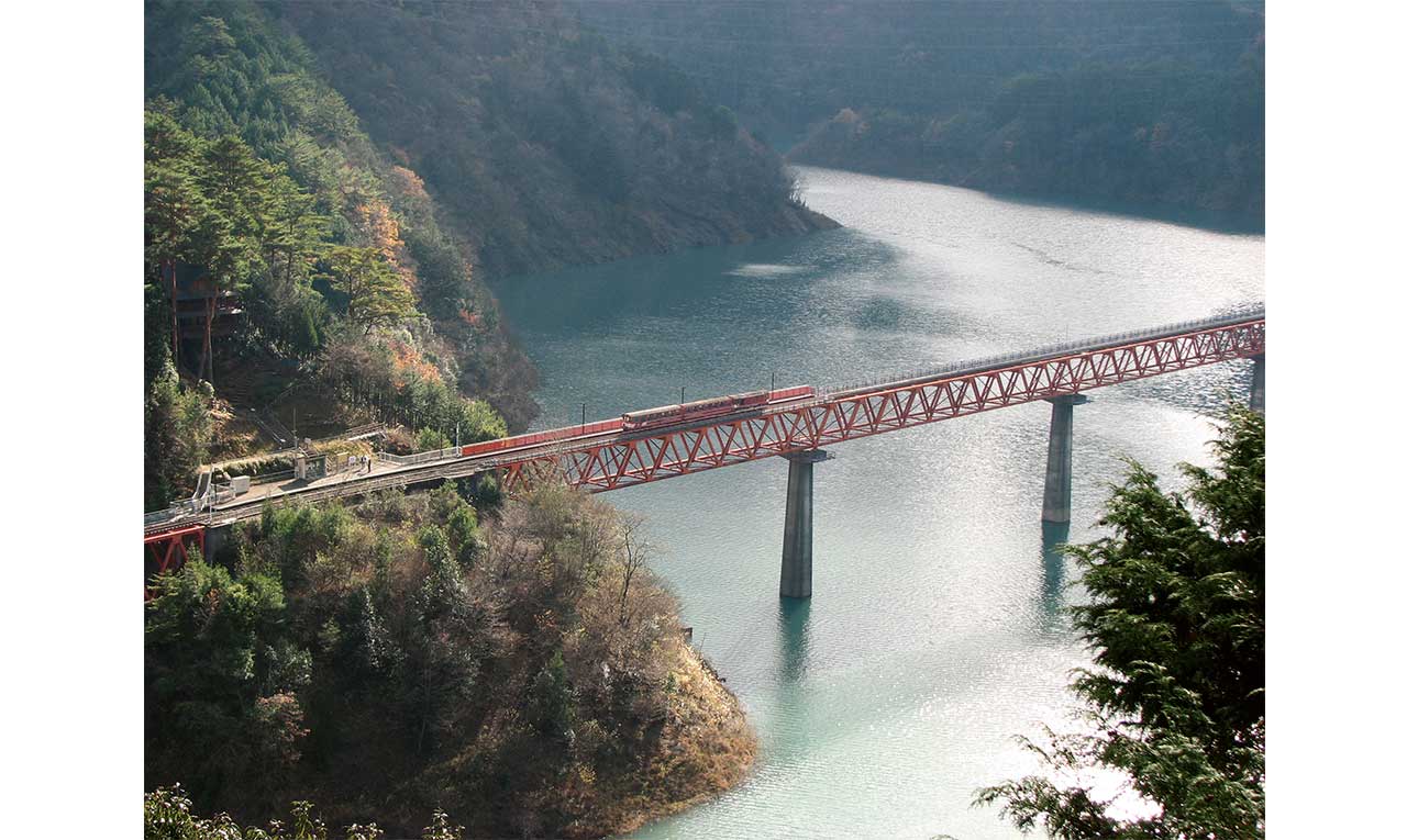 接岨湖上の半島の先端にある駅は、接続する道が1本もなく、レインボーブリッジと呼ばれる赤い鉄橋上の歩道を湖上散歩して行くことになる。かなりスリリングな行程だ。対岸に駐車スペースがあるので、そこにバイクを留めて行ける
