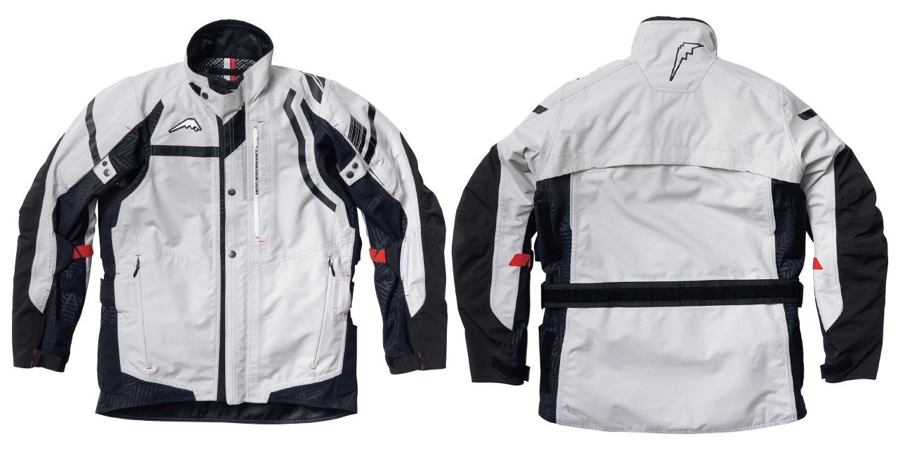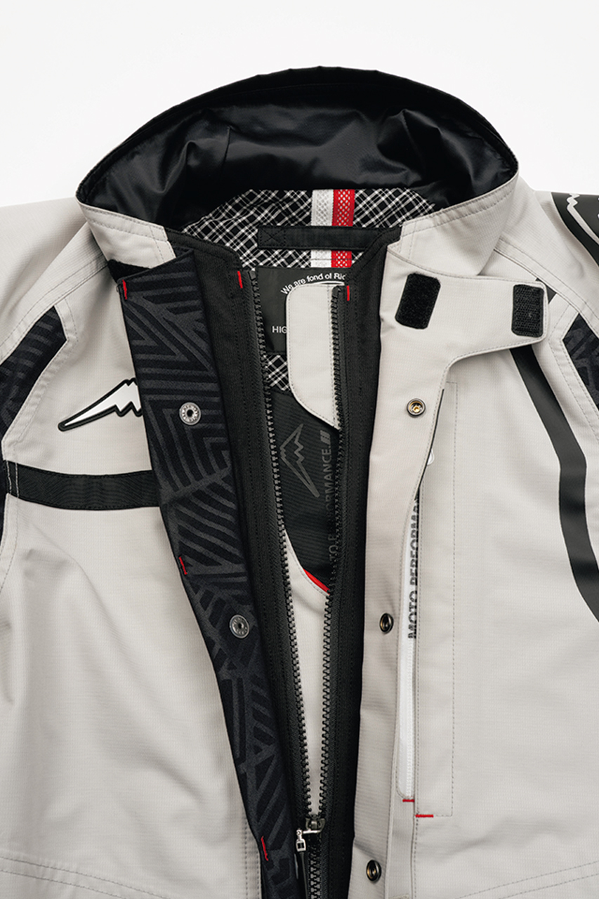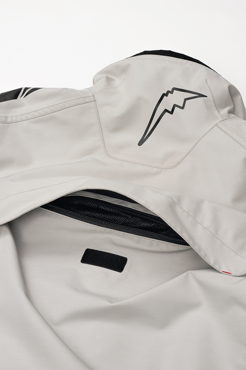 ファスナー+フラップ付きの防水仕様で、雨水の浸入を防ぎ、防風にも一役買っている。胸部には別売りのネオレーシングチェストプロテクターを装着可能。内ポケットも備える