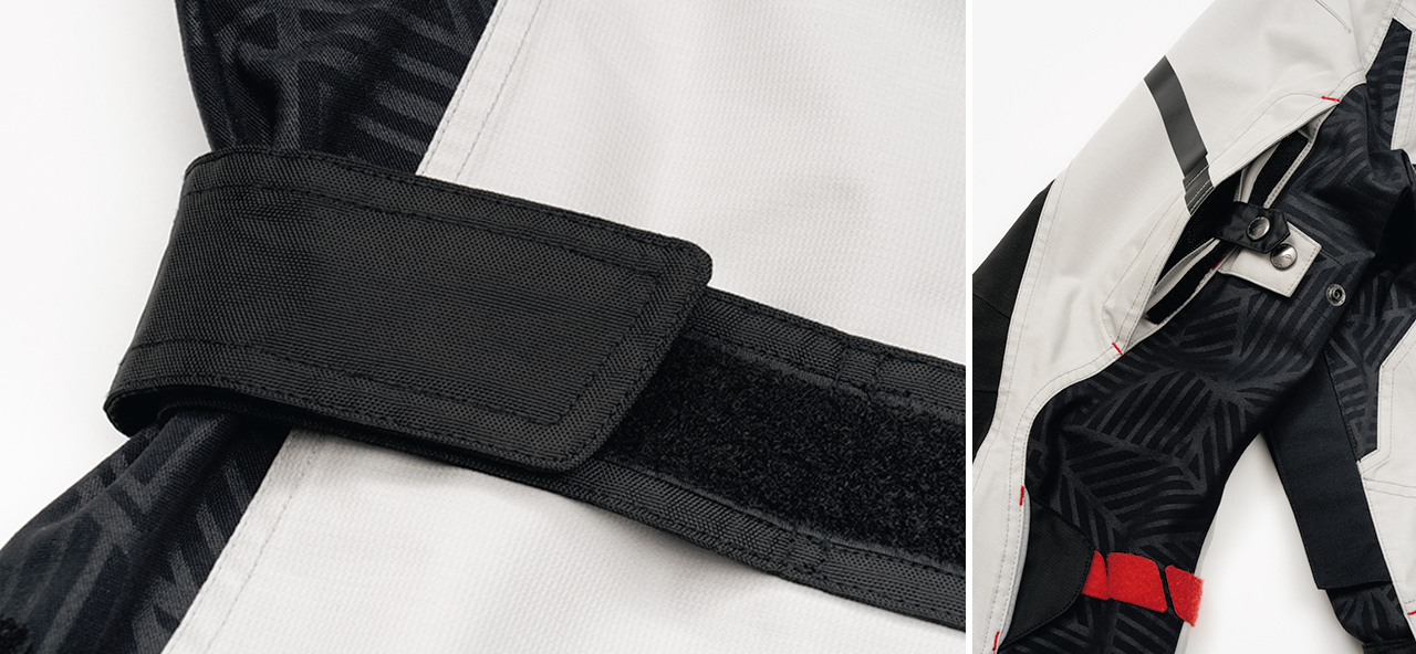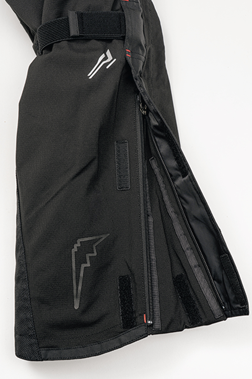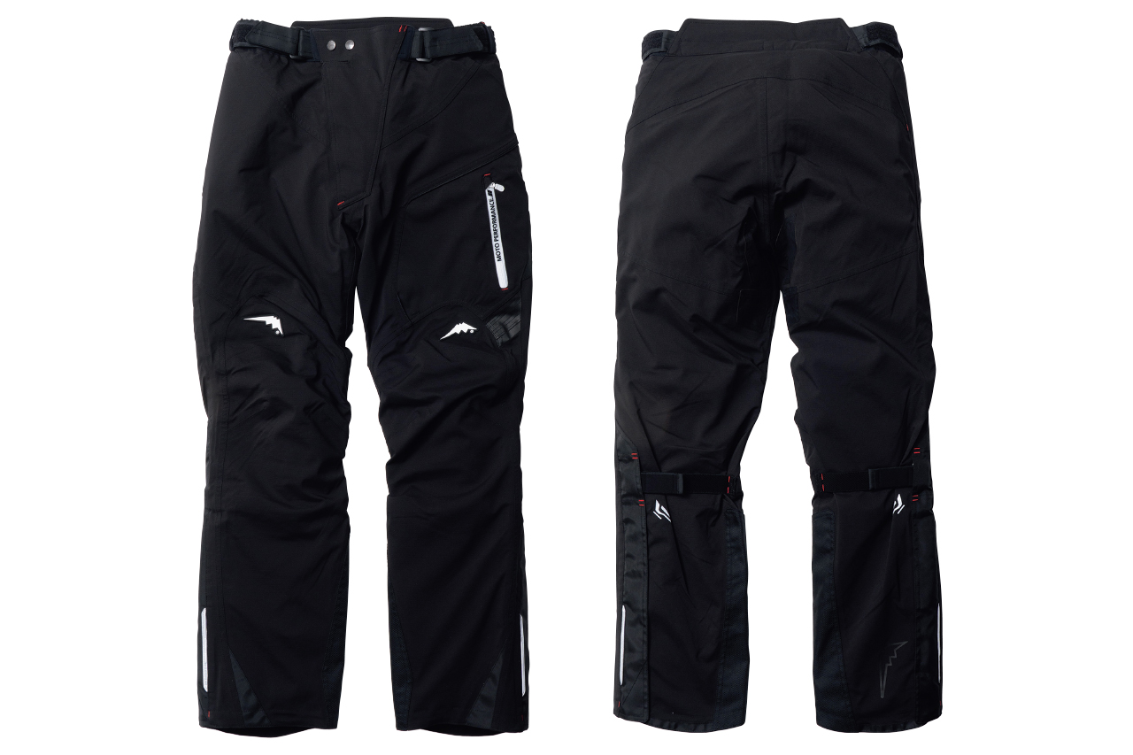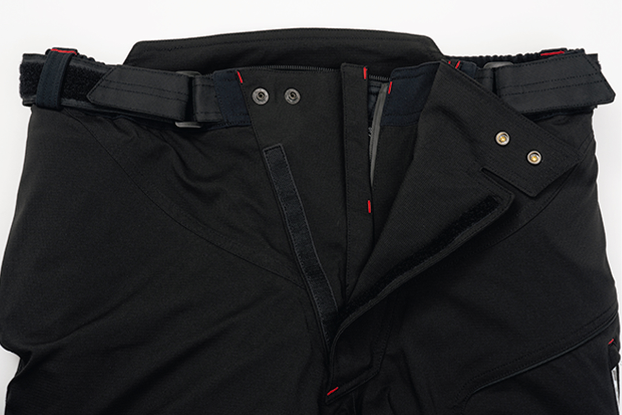 一方のパンツは、着脱式のキルトインナーを搭載し、秋冬から春先まで幅広いシーズンに対応。ファスナー部は走行風を遮断する二重構造に加え止水仕様を採用し、防寒性・防水性ともに高水準だ。太ももには使い勝手の良い止水ポケットを備え、内側には滑り止め素材を配置。ワインディング走行時の安定性を高めている。膝にはCEプロテクター、腰にはパッドを標準装備し安全性を確保。外部調整ベルトや裾の耐熱・耐摩耗素材など、細部にまでライダー目線の工夫が行き届いている。
