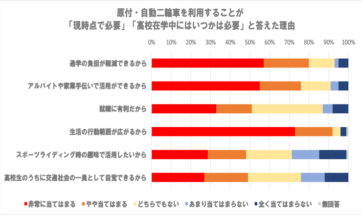 「現時点」「在学中」に必要と答えた理由の中では「生活の行動範囲が広がるから」という理由が最も多く、次いで「通学の負担軽減」「アルバイトでの活用」と続く。全国的にも平地の多い埼玉県では移動に不便を感じている生徒も一定数いるようだ