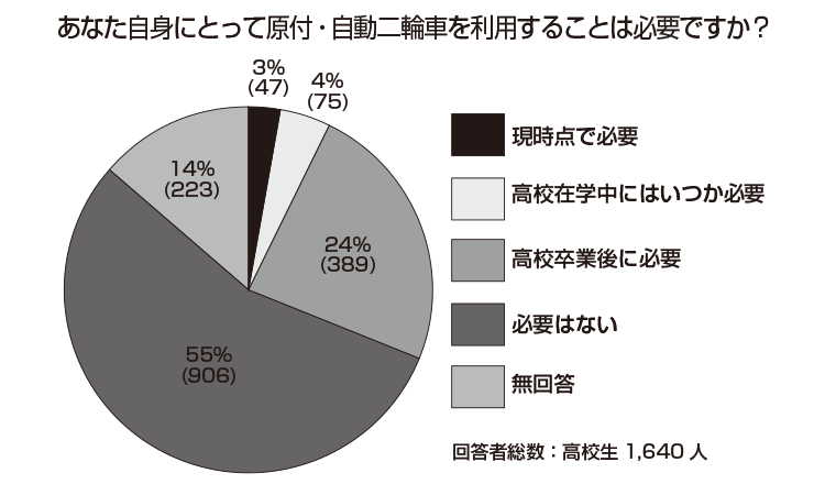 近年叫ばれているQOL(クオリティオブライフ=個人の生活の質)の向上は高校生の日常生活にも考慮されるべきだろう。三ない運動下でも、高校生はバイクという移動手段を求めている。このアンケートからは、そうした潜在的なニーズが垣間見えてくる。