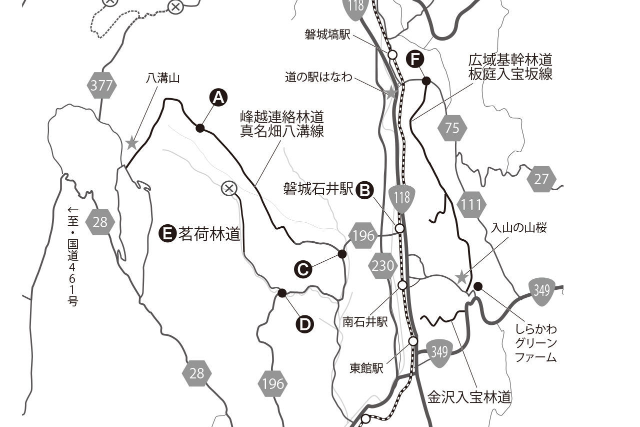 お城を模した展望台からは富士山も遠望できるという。その八溝山周辺には林道群があり、1日中遊べるエリアとして人気だったが、そのメインとも言えるのが峰越連絡林道真名畑八溝線だ。取材時には路面崩落Aがあったのだが、現在は修復済み。磐城石井駅Bから県道196号で茗荷方面へ向かい、八溝川にかかる橋を渡ったところで右へC。八溝川に沿って真名畑方面へ進むとダートがはじまる。先ほど人気だったと書いたのは、修復工事は終わったものの、落石や倒木があり暫定的に通行止めとなっているから。再開を待とう。