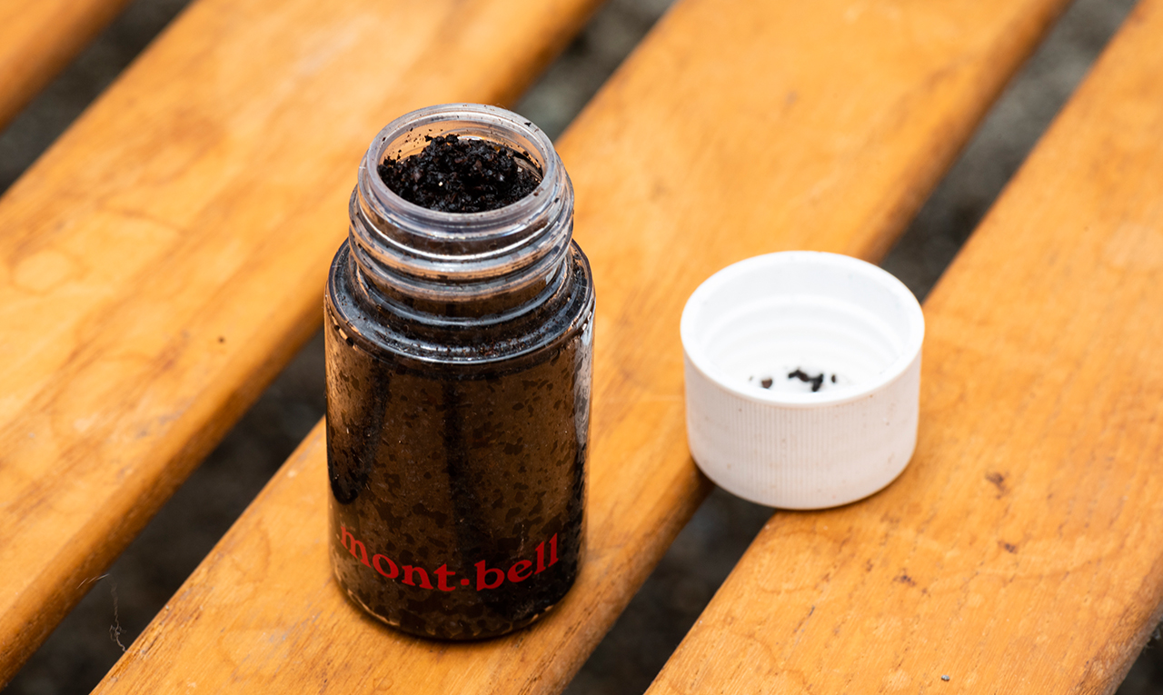 ❹コーヒーカスを乾燥させて灯油かライターオイルを染み込ませれば着火材になる。密閉できるミニボトルに入れて持ち歩く。3~4泊ぐらいなら十分対応可能。チューブ式のアルコール系着火剤より断然スマートだと僕は思っている。
