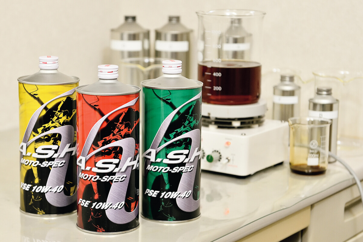 「MOTO‐SPEC FSのベースオイルはPAO(ポリアルファオレフィン=粘度指数が高く、低温流動性に優れる高性能ベースオイル)です。一言にPAOといってもさまざまな種類が存在しますから、A.S.H.で使用している高品質なものを誰もが用意できるかはわかりません。弊社で独自開発した添加剤も使用しています。これは他には存在しませんので、そもそも用意できません」