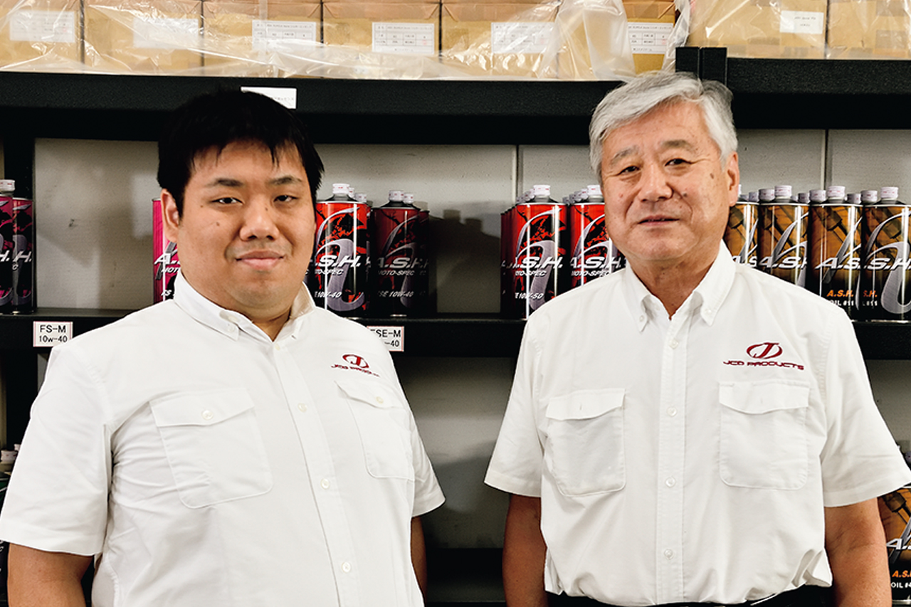 右の人物が、ジェイシーディプロダクツ代表の岸野修さん。オイル・ケミカルのエキスパートであり、バイクや四輪のメカニズムにも精通している。左は、同社スタッフの岸野鉄平さん。フィーリングリポートのほか同社製品の開発に関与する