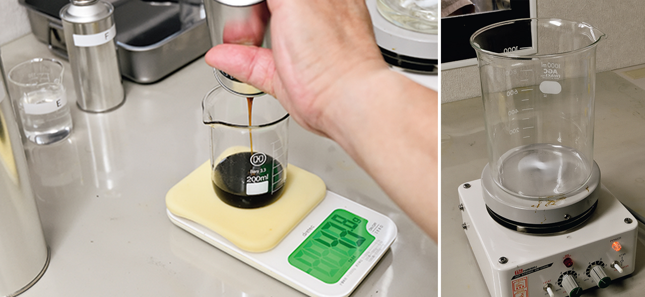 加える添加剤の量の計測は、体積ではなく重量を基準にして行う。粘度の高いベースオイルや添加剤はビーカーの内壁に張り付いてしまうので、その分だけ多めに軽量するのだが、その匙加減は完全に職人仕事