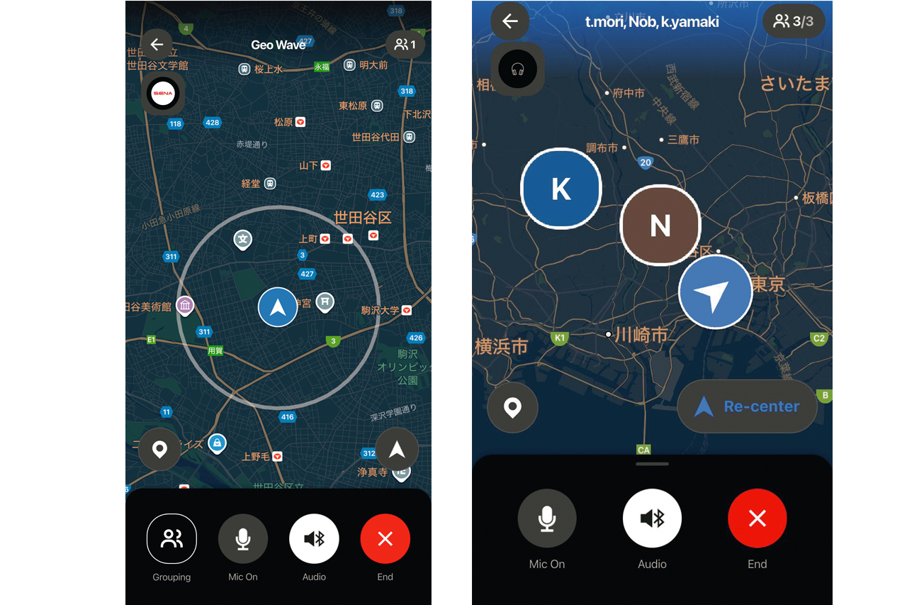 操作は驚くほどシンプル。スマホで「WaveIntercom」アプリを開き、SENAインカムのメッシュボタンを2回タップするだけで、WAVEモードが起動する。対応していないインカムの場合でも、アプリ画面の「GeoWave」ボタンを押すだけで同じように通話を開始できる。さらに、通話中にジョグダイヤルやセンターボタンをタップすれば、瞬時にMESHインターコム通話へ切り替え可能。市街地など通信エリアではWAVE、山道や圏外エリアではMESHと、環境に応じて最適な通信モードを選べるのがSENAの強みなのだ。