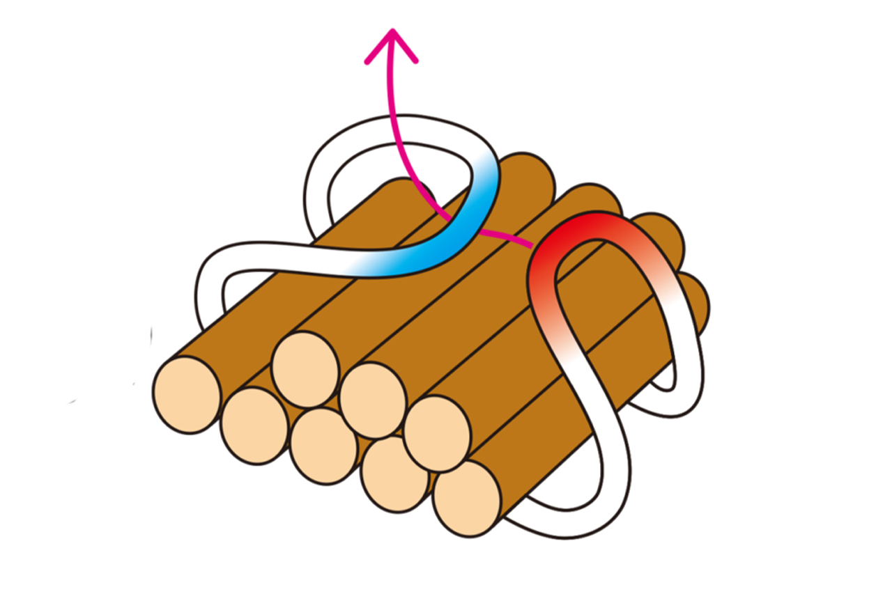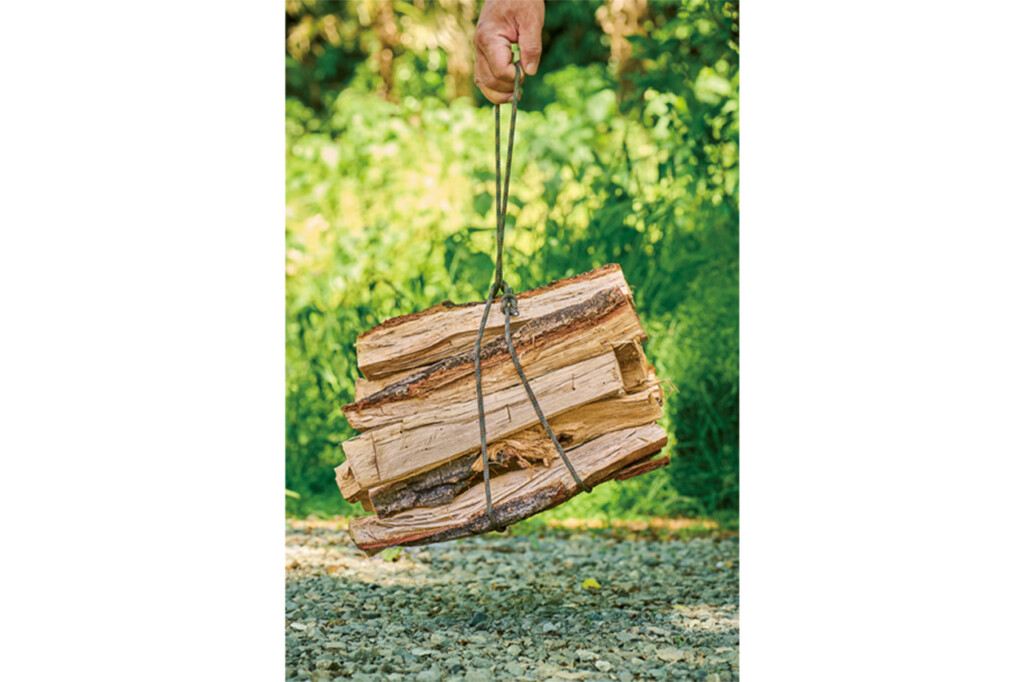 くぐらせた方の先端を上に引き上げて、薪を崩れないようにまとめる