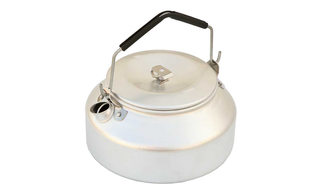手ごろなサイズのコンパクトケトル。本体はアルミ、ノブ部分がステンレスなので、ハンドル部のカバーを外せば焚き火にかけることもできる。お湯が注ぎやすいのもケトルならでは