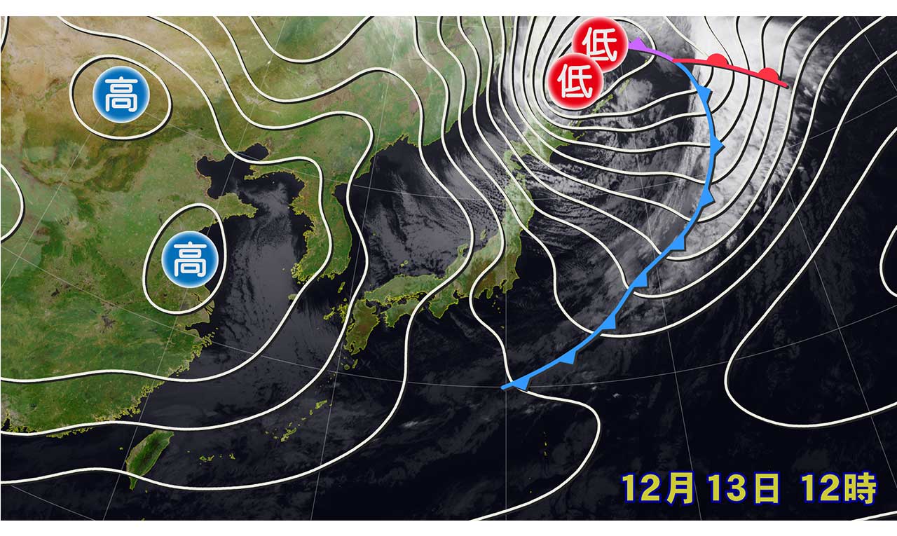 2021年12月13日の天気図と雲画像。2022年はこの「西高東低の冬型」がいつも以上に多いかも