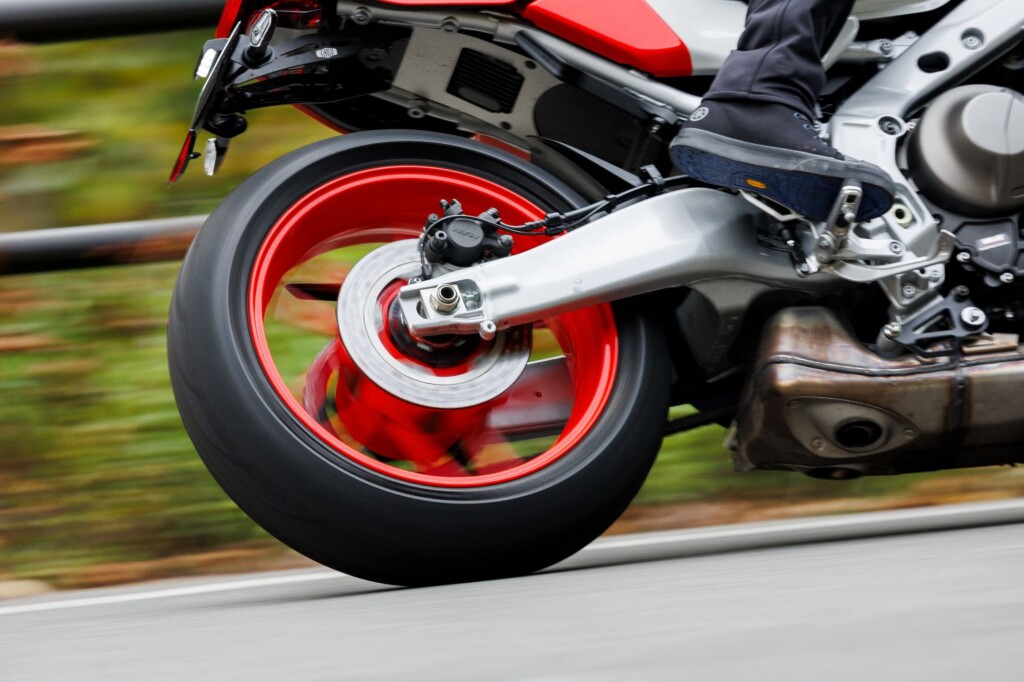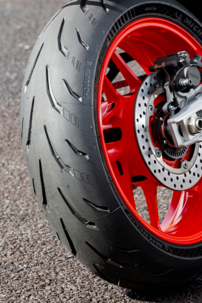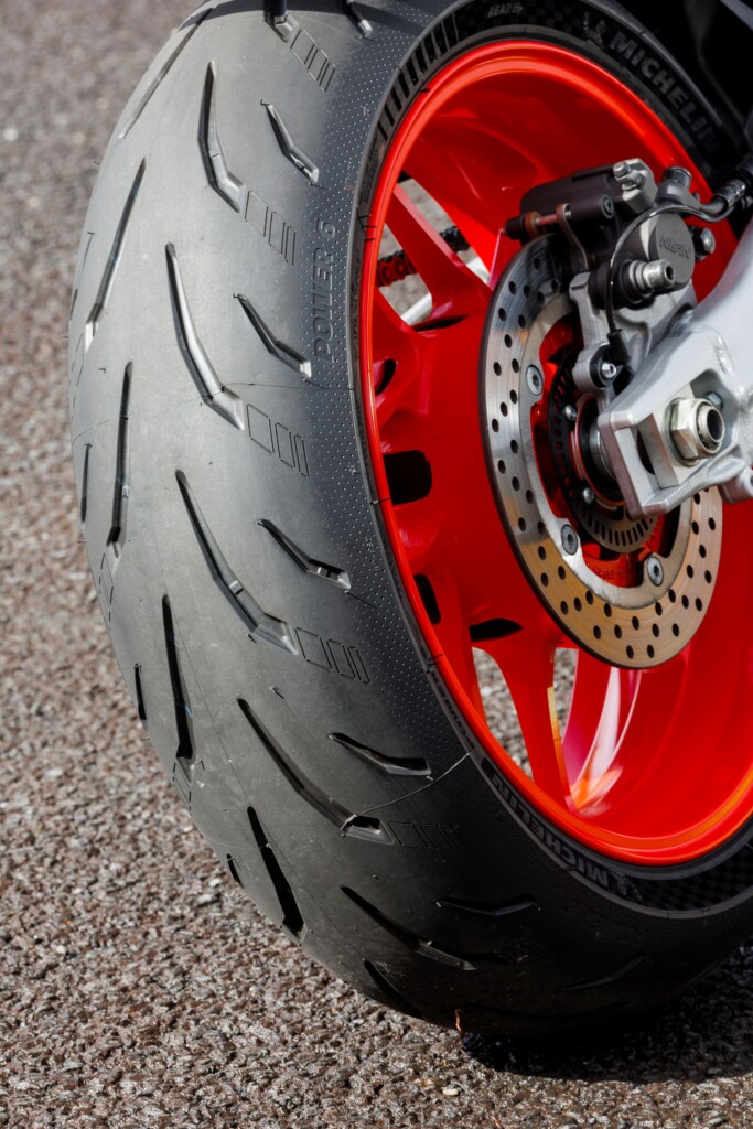 スポーツタイヤなのでツーリングタイヤよりもトレッドのブロックが大きく、べたっとした安定感を感じる。走り始めてすぐのタイヤが温まっていない状態でも、フロントが切れ込むような不安定さはみじんもない。もちろん身体とバイクのウォーミングアップは必要だが、タイヤに神経を使うことはない。この「気にならない」という感覚はタイヤがしっかり機能しているからだろう。直進時の安定感とは裏腹に、レーンチェンジでも俊敏な動きを見せるパワー6。カーブへのアプローチでも明確な向き変えを瞬時にこなす。とはいえ、足元をすくわれるような感覚はなく、俊敏なのに常にグリップを冠じゃているのである。コーナリングを楽しむ正確ながら、バンク中に急に現れた路面の裂けめのような溝を斜めに乗り越えたときは、一瞬身構えたものの、何事もなかったように通り過ぎた。低速で慣性力がさほどかかっていなくても、タイヤの高い衝撃吸収性が感じられた。ウエット路面にも遭遇したがブレーキングも含めて、神経質にならずに走り続けられた。帰路の高速道路でも直進時の安定感はそのままなのに、時速100㎞でもスッとバイクが動く。繰り返しになるが、俊敏なハンドリングと抜群の安定感は素晴らしく、スポーツ派のツーリングライダーにはこの上ないタイヤであろう。若かりし頃、TZRやFZRでレースやツーリングをハイグリップタイヤで楽しんでたベテランライダーはもちろん、スポーツタイヤは」自分には関係ないと思っているライダーにも履いてもらいたい。自分のバイクのスポーツ性を見直し、大きな操る楽しさを感じることだろう。