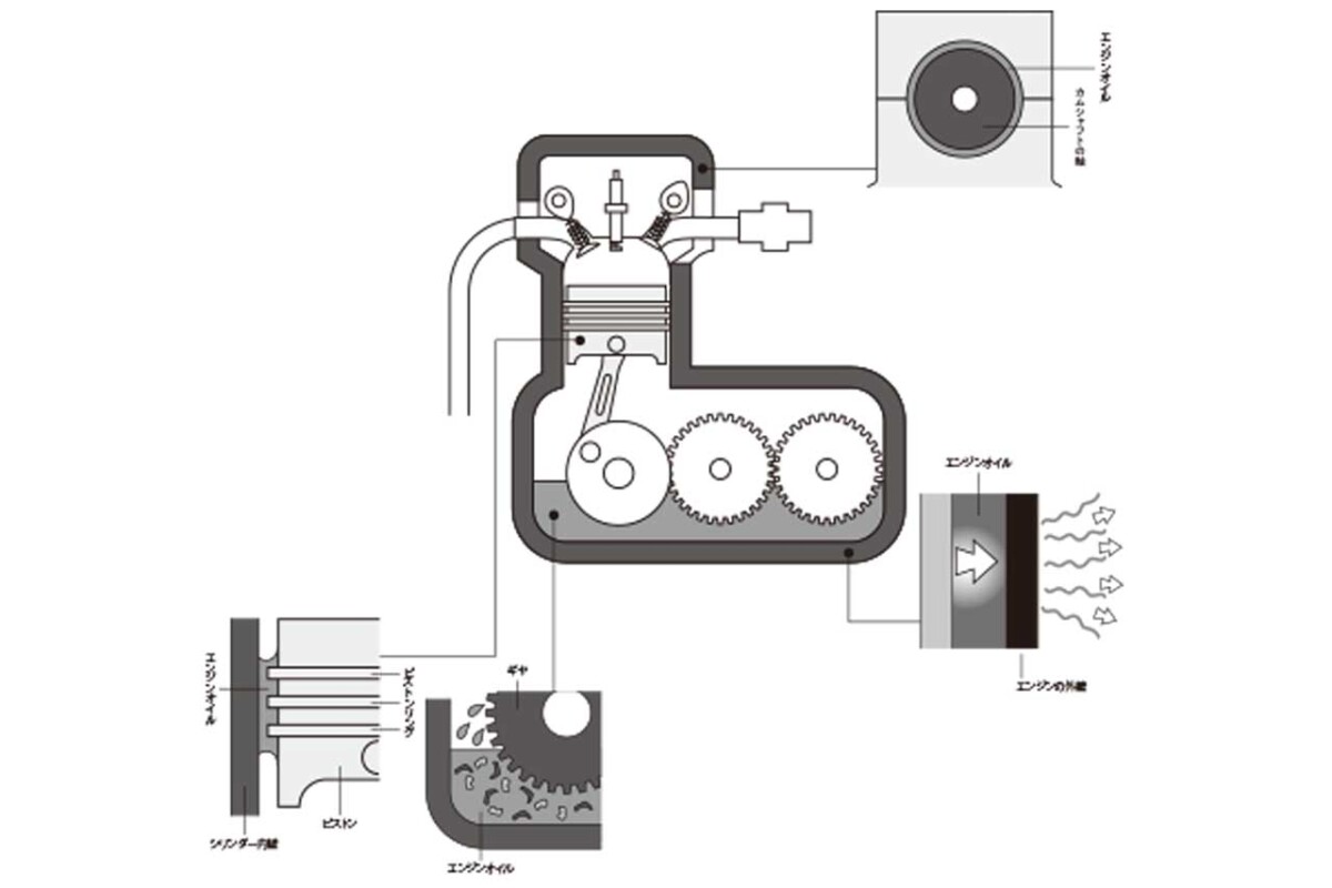 エンジンオイルは潤滑油の一種。エンジンは、ほぼ金属製の部品で構成されている。摩擦を軽減しスムーズに動かすため潤滑の必要があることは想像しやすい。“潤滑”はエンジンオイルの重要な役割。だが、それだけではないのだ。