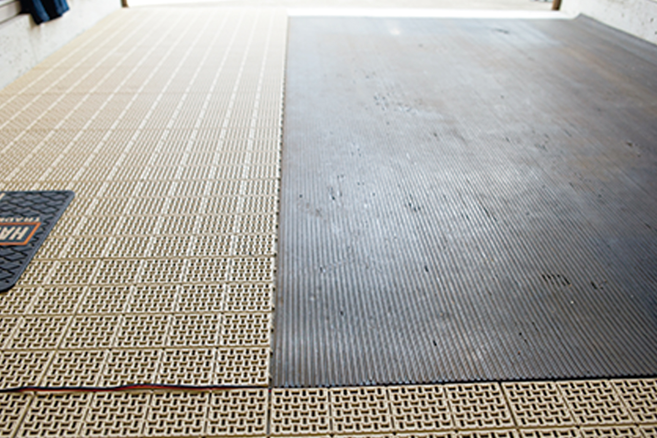 ②床はホームセンターでベランダ用のタイルを購入して設置。バイクを置くスペースには軽トラックの荷台のゴムマットを敷いている