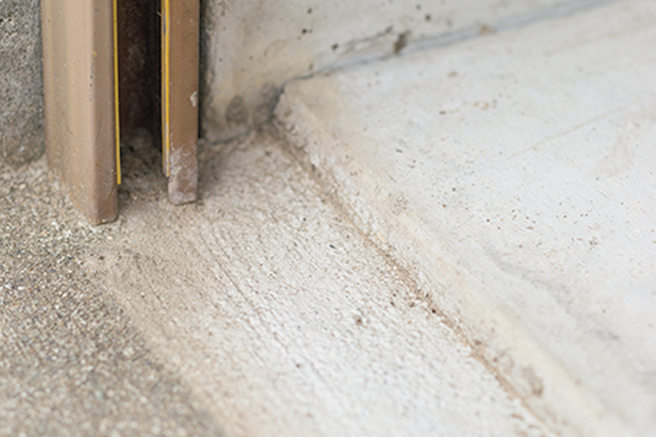 ③入口の床の部分には、あえて数センチの段差を設けている。ここがフラットだとシャッターと床の隙間から砂埃などがガレージ内に入ってくるそうだ