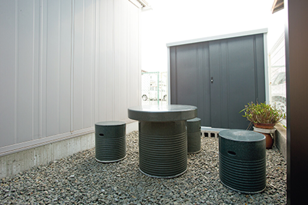約53㎡の敷地面積に、約15㎡にヨドコウのガレージを設置。屋外部分は、クルマやテーブルなどを置き、自由空間として利用している。ガレージ裏側にはDIYの花壇もある