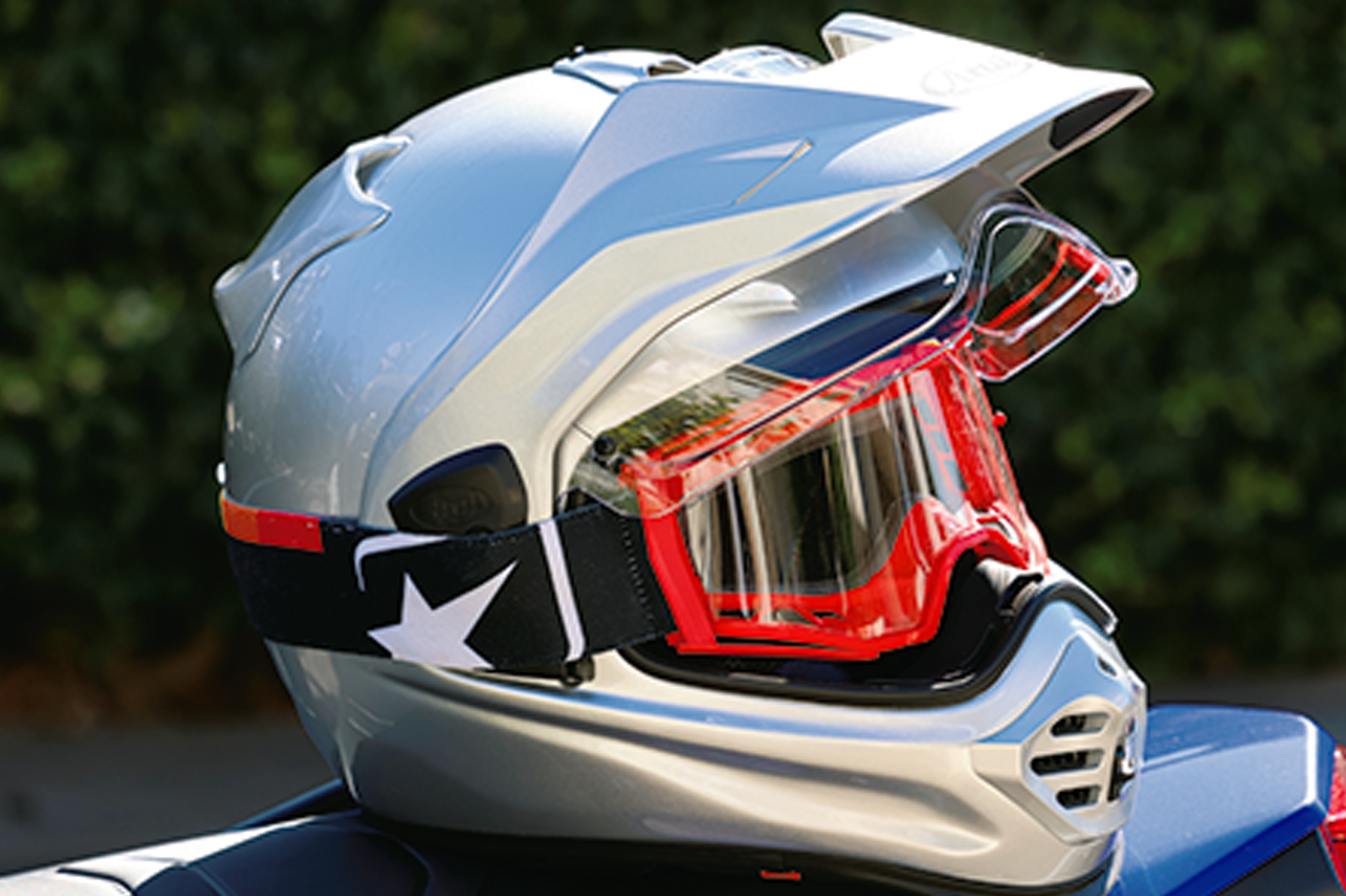 林道ツーリングで便利なのはシールド付きのオフロードヘルメット。ゴーグルを組み合わせられるモデルもある