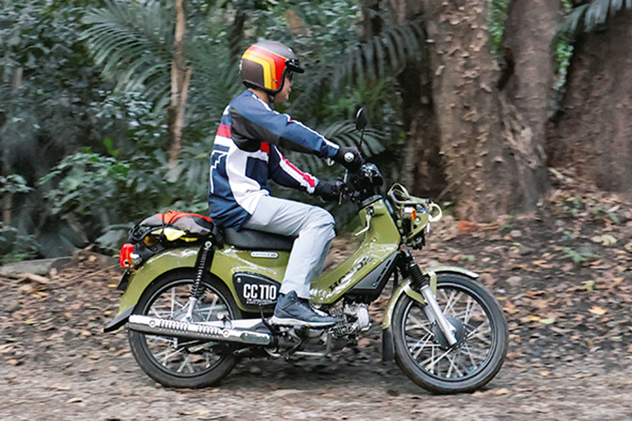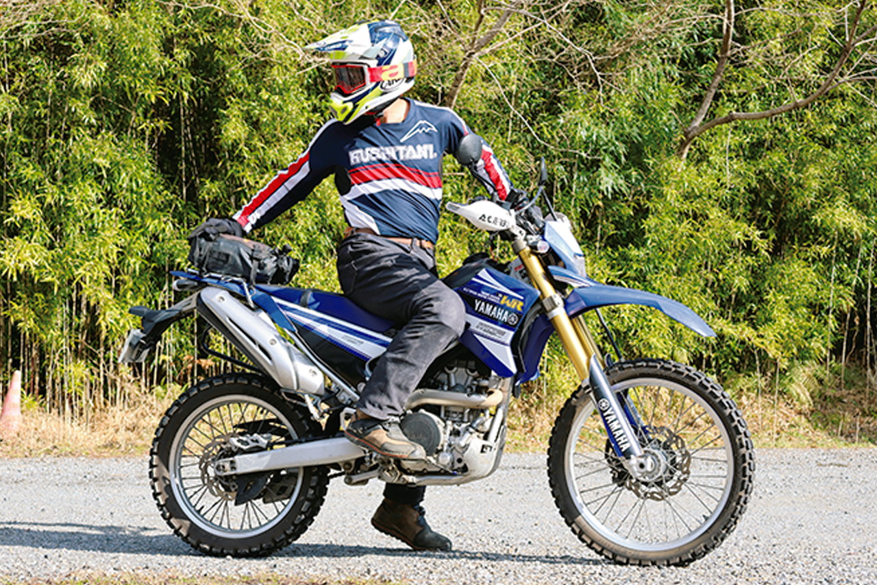 100%オフロードウエア&装備で固める必要はない。筆者はクシタニの皮パン「エクスプローラージーンズ」を林道で愛用