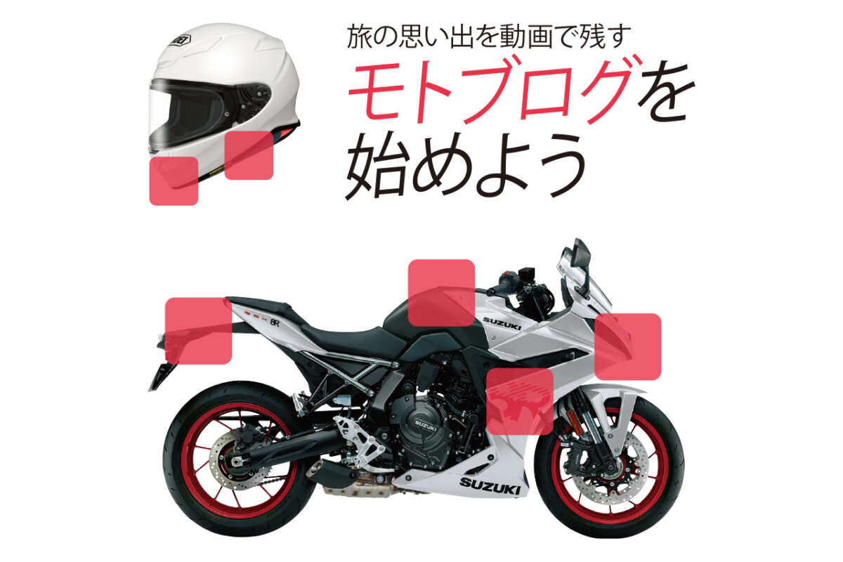 カメラはヘルメット、もしくは車体のどこかに取り付けるのが一般的。取り付ける場所によって撮影できる風景や雰囲気が異なってくるのでいろいろ試してみるのもオススメだ。メリット・若干のデメリットもあるので、自分が撮影したい動画を考えながらベストなポジションを探してみよう。ほかにも首から下げたり、ウエアに装着する方法もある