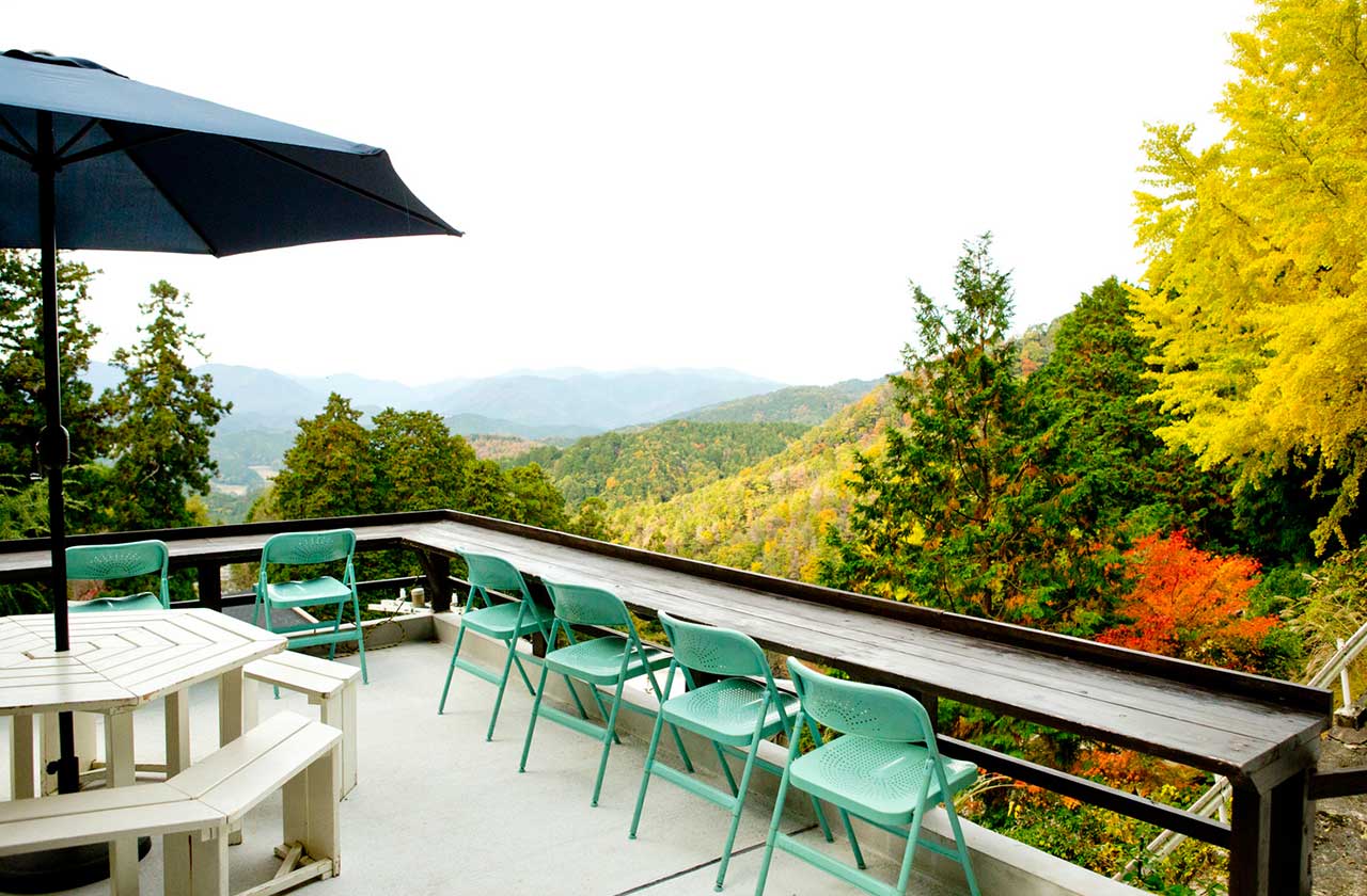 境内にあるカフェ「ほんたき寺巣」。妙見山や遠くは丹波の山々まで見渡すバイク寺随一の眺望スポット。ここから眺める紅葉もオススメ