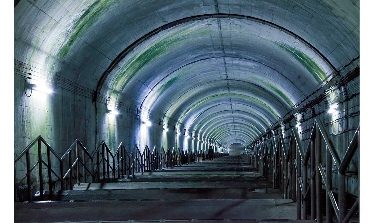 JR上越線・新清水トンネル内の鉄道駅で、無人改札から地下ホームまで約70mの高低差! エスカレーターはなく462段の階段で行き来する。真っ直ぐに伸びるトンネル階段は異世界ムード満点だ