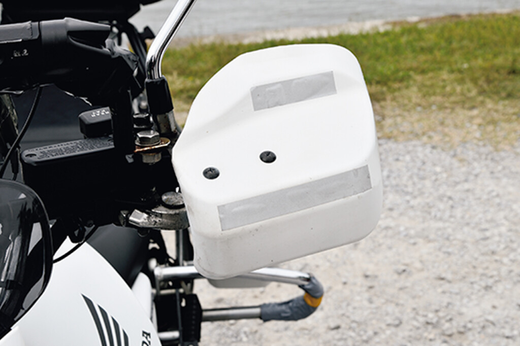 サイドバック、回転灯は輸入品。ギャングパーツのバンパーセットを装着。青色回転灯は道路運送車両法に抵触することが分かり黒色でペイント。スピーカーはダミーでもちろんサイレンを鳴らすことは御法度だ。また本来、白バイにはハンドルガードは装備されていないが、あえて装着して視認性向上のために反射テープを貼っている