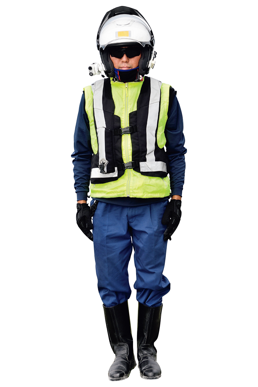 ヘルメットは一部白バイ隊のベースにも採用されているSHOEI のJ-FORCEに反射テープを貼って、ドライブレコーダーも装着。ウェアはレプリカなどが出回っているが、あえてそれらを着ずに、反射板もまた視認性の高いものを採用。もちろんプロテクターも装着