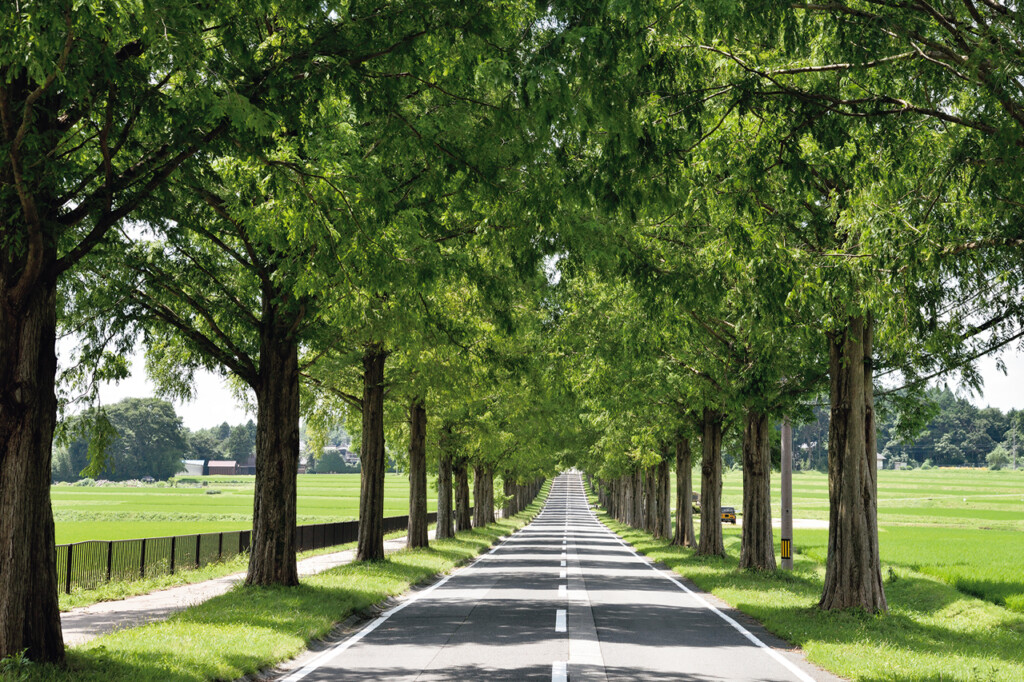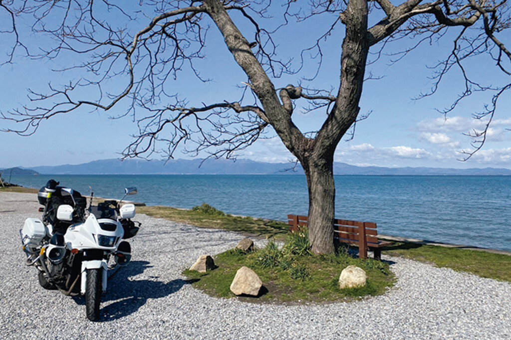 高島市の「メタセコイヤ並木」(写真上)や、彦根市の「あのベンチ」(写真右)など、琵琶湖の周辺には多くの絶景スポットが点在している。遠見さんのツーリングでは交通安全&防犯活動だけでなく、それらの琵琶湖の名所にも訪れて、その魅力も発信している
